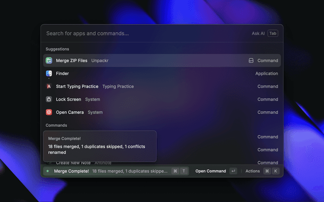 1. Open Raycast and search for "Merge ZIP Files"