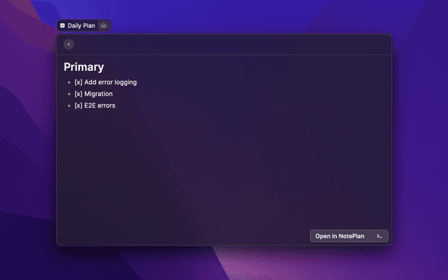 Allows you to see your daily plan, search notes and launch straight into NotePlan.