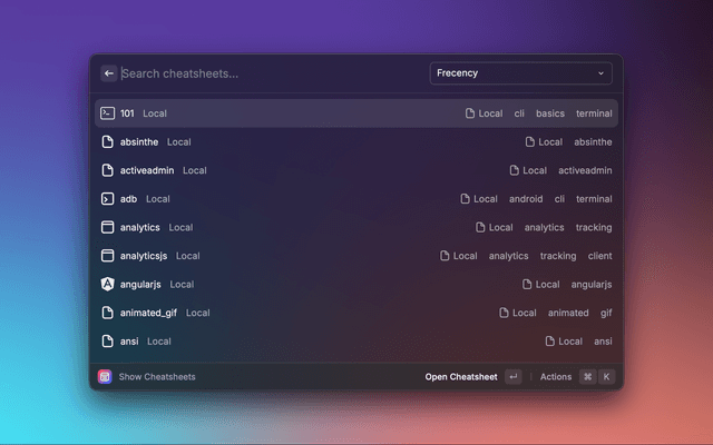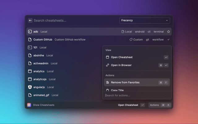 Access a curated collection of DevHints cheatsheets plus the ability to create and manage your own custom sheets - all without leaving your keyboard. You can also import Markdown cheatsheets directly from your GitHub repositories and keep them up to date via a built-in Repository Manager. Search is smart and fast, prioritising titles over content so you find what you need instantly.