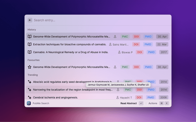 Search PubMed, a free database maintained by the National Library of Medicine (NLM), with Raycast. If the search entry is empty, 10 Trending Articles (from https://pubmed.ncbi.nlm.nih.gov/trending/) are displayed and cached. You can set the refreshInterval in settings.