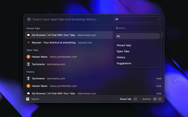 Search your open tabs and browsing history in Dia