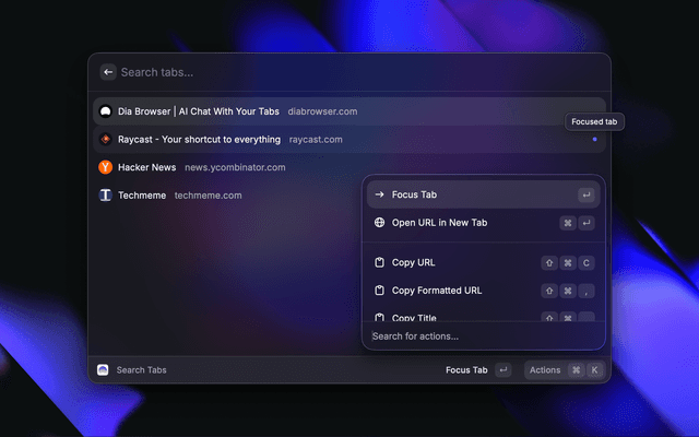 Search and quickly navigate your Dia browser's history and open tabs from anywhere on your Mac. You can open recent tabs in Dia or other browsers as well as copy websites to quickly share them.