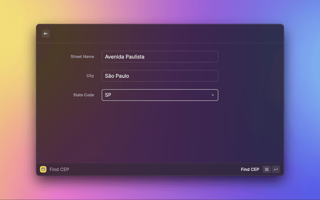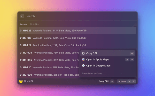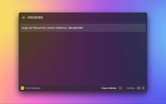 The ViaCEP extension for Raycast is designed to streamline the process of finding Brazilian addresses and postal codes (CEPs), offering quick and easy access to the ViaCEP API services.