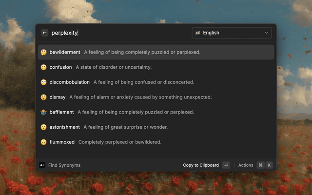 This Raycast extension allows you to search for synonyms using a Language Model (LLM) such as OpenAI, Grok, or Anthropic, with your own API keys.