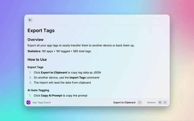 The extension includes a carefully crafted prompt for AI assistants to automatically generate relevant tags for your applications. After exporting your tags: